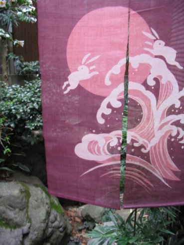 荒波と遊んでいるうさぎに躍動感があり、うさぎと対照的な荒波がかわいい兎をより一層引き立てています。バランスも配色も熟練の技のなせるもの。店舗の入り口や、洋風のお部屋でも全く負けない強さのあるのれんです。余談ですが、うさぎは他の動物とちがって神格化されて扱われることが多く、昔は月に住んでいると信じられていました。月から飛び出したうさぎが玉兎で歌舞伎舞踊の演目にもなっています。