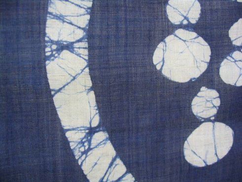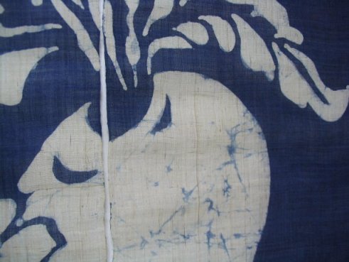 生成りの無地に図柄を蝋で描き、浸染にて染め上げました。蝋のひび割れた部分に微妙に染料が入り込んで筋を描き、独特の染め上がり・風合いをかもし出します。
