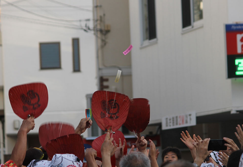 お札まきは、これまで荒天中止になったことがほとんどないという晴れのお祭り。