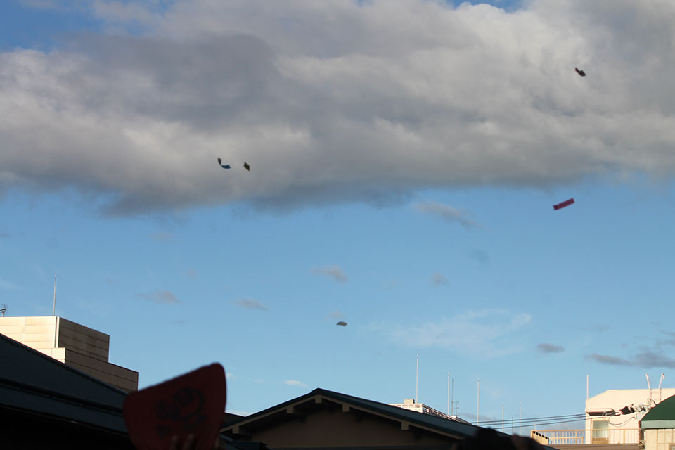 今年のお札は風に乗って、とにかくよく飛ぶ!