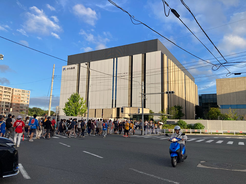 中外製薬の前で!