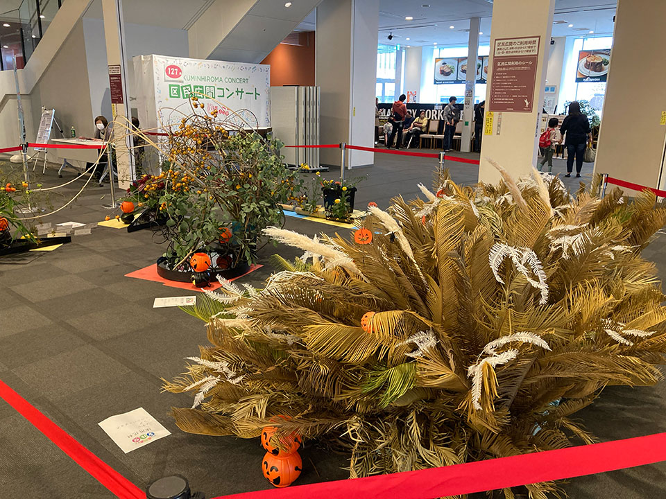 ロビーに広がるハロウィンモチーフの生花作品