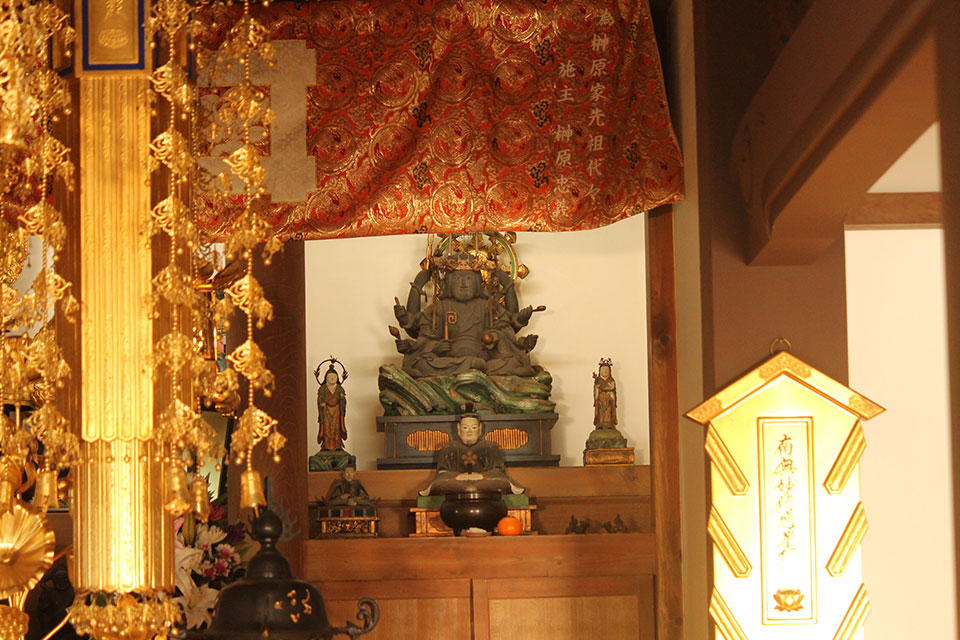 本堂の弁財天。手前には天神様(菅原道真公)のお姿もあります。