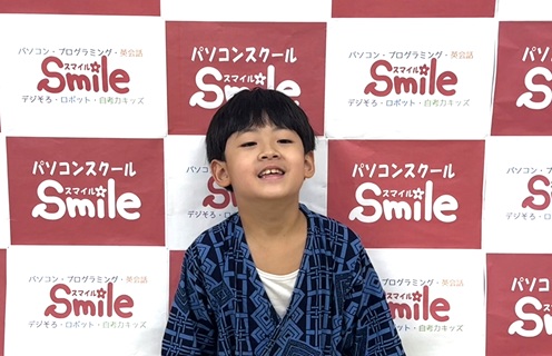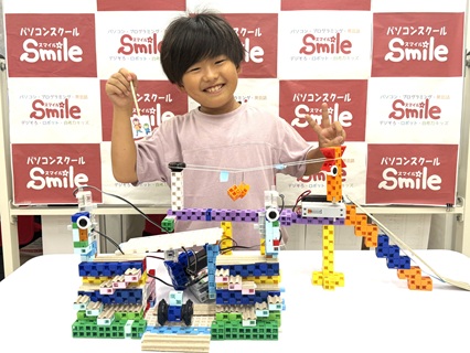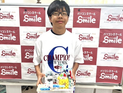 自分の日本予選の結果が1位だと聞いて、とてもびっくりしました。たくさん練習したから日本1位になれました。はじめに作ったロボットは1本の長い鼻が特徴のぞうさんにしました。ですがそこから2本の大きな牙を持つクワガタムシに改造しました。牙で黄色い果物を落とせるように工夫しました。決勝大会でも良い結果が出せるように頑張りたいです。