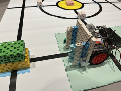 小学3年生以下の作品とは思えないロボットの仕上がりにびっくりしました。ピースを運ぶための構造がそれぞれ工夫されブロックのつなぎ方、選び方もそれぞれ違い特徴が出た作品でした。ピースの運び方もこぼれがないようよく考えられていたと思います。競技中の子供たちがコントローラーを持ち競技マップのまわりをロボットの行き先を見ながらコントロールしている姿はとても集中していました。